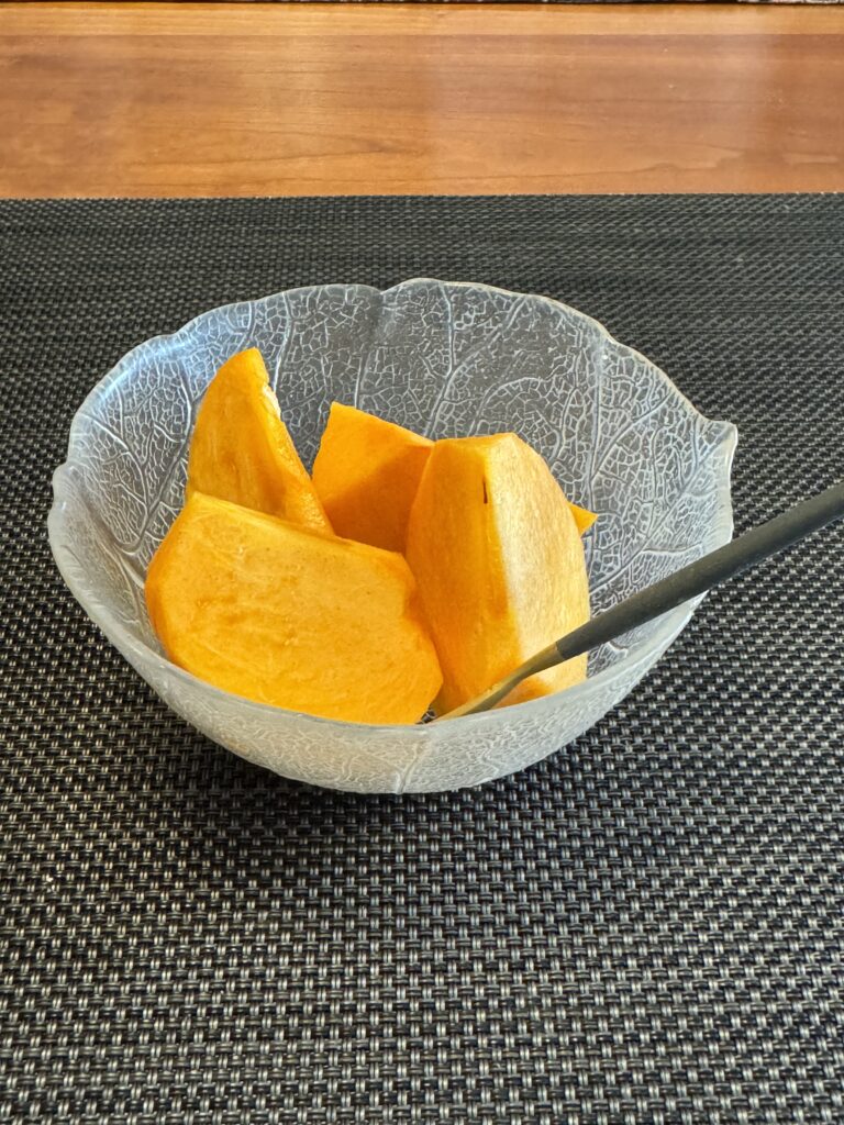 デザートは九州の姪が送ってきてくれた柿 これは、太秋柿という種類らしいですが、糖度が半端ない柿です