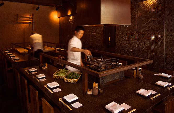 炭火の焼き台をぐるりと囲むカタチのカウンター席 端に90度の角度で座って話ができるようにアレンジしてくれてました ありがたやー
