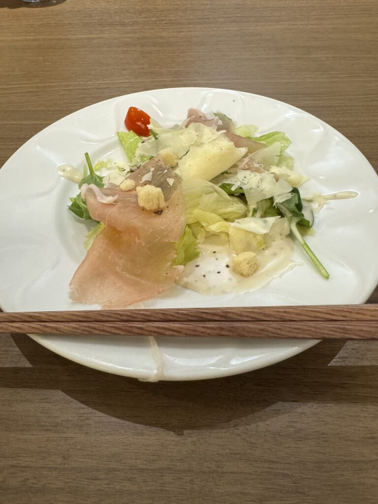 お箸でいただくシーザーサラダ アメリカで食べるサラダの1/10くらいの量ですが、日本人用の前菜サラダとしてはこのくらいの量でいいですね