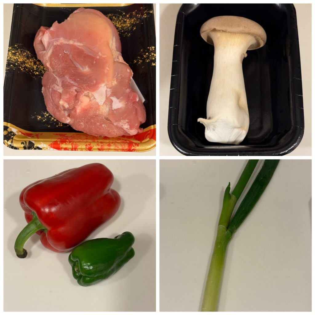 左上 鶏肉はやっぱりもも肉がいいですね 冷蔵庫から取り出して塩胡椒を振っておきます