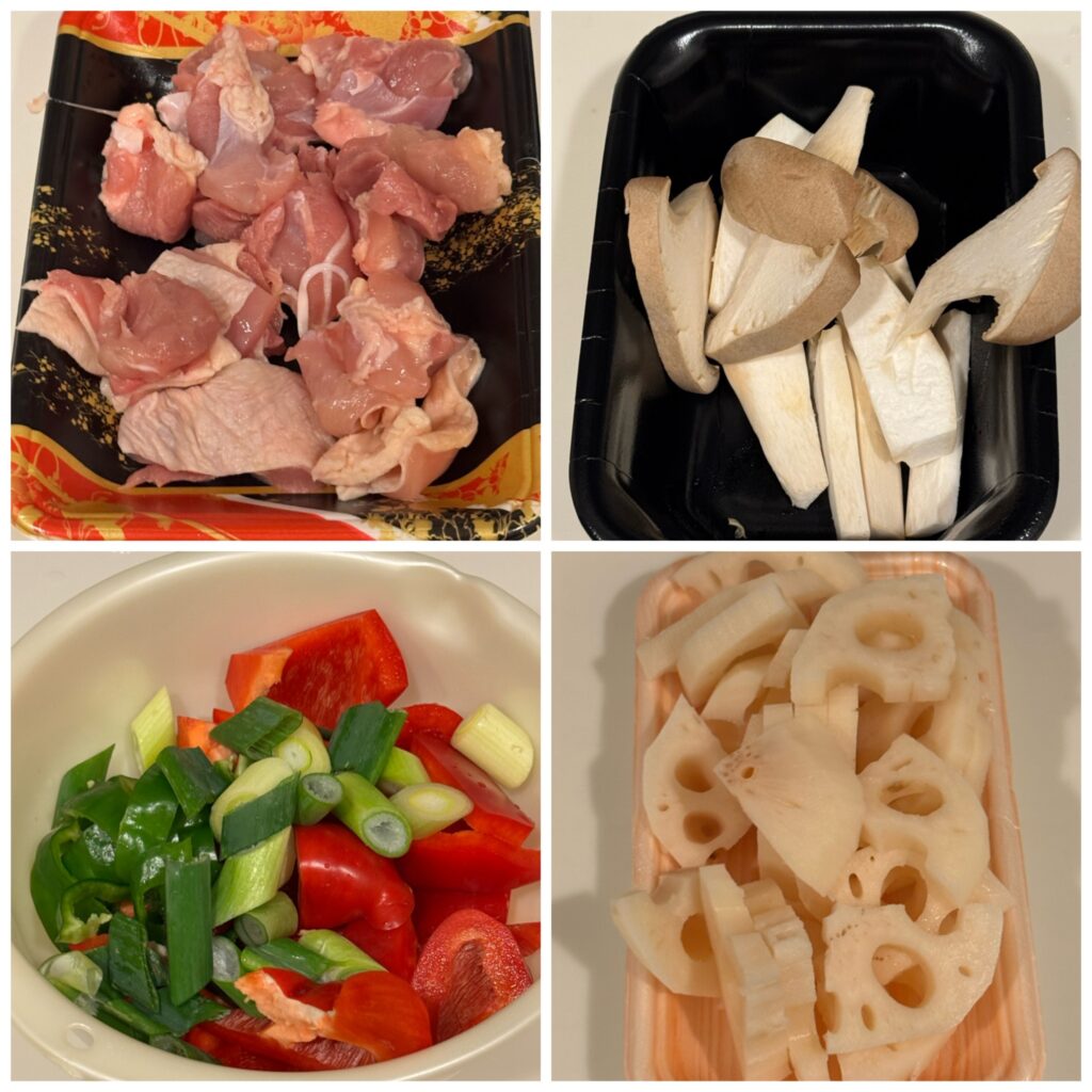 エリンギや赤パプリカ、ピーマン、レンコンを適当な大きさに切ります