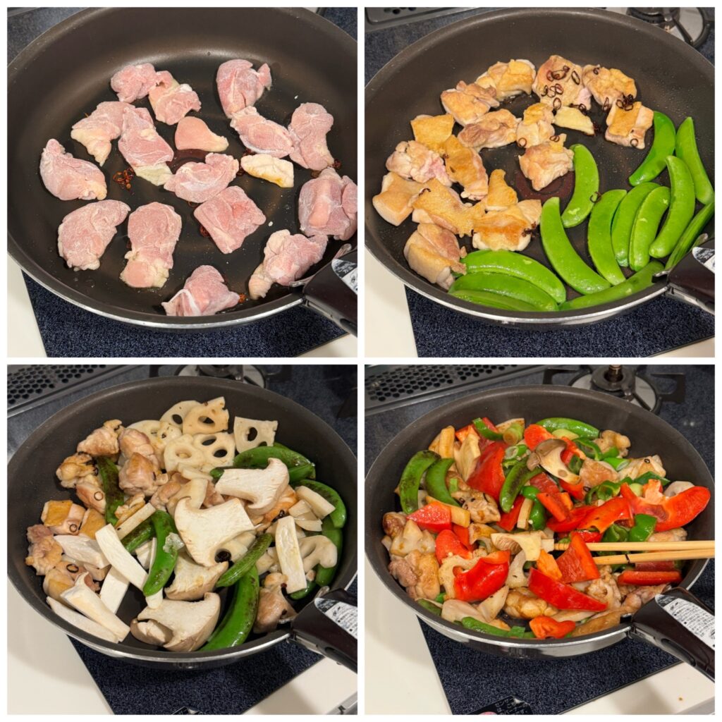 左上 最初は鶏肉 油を引いたフライパンに皮目を下に入れて焦げ目がつくまで炒めます