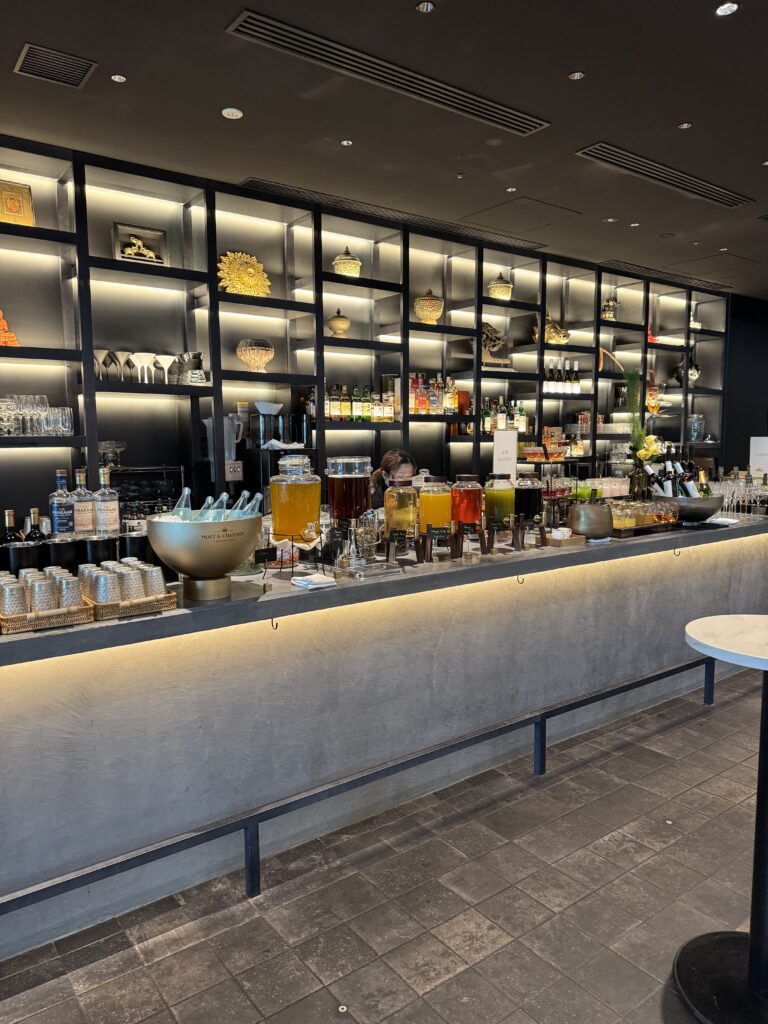 60分のドリンクフリーフローが付いてるランチのドリンクコーナー 左側がノンアルで右側がアルコール飲料です とてもおしゃれにディスプレイされています