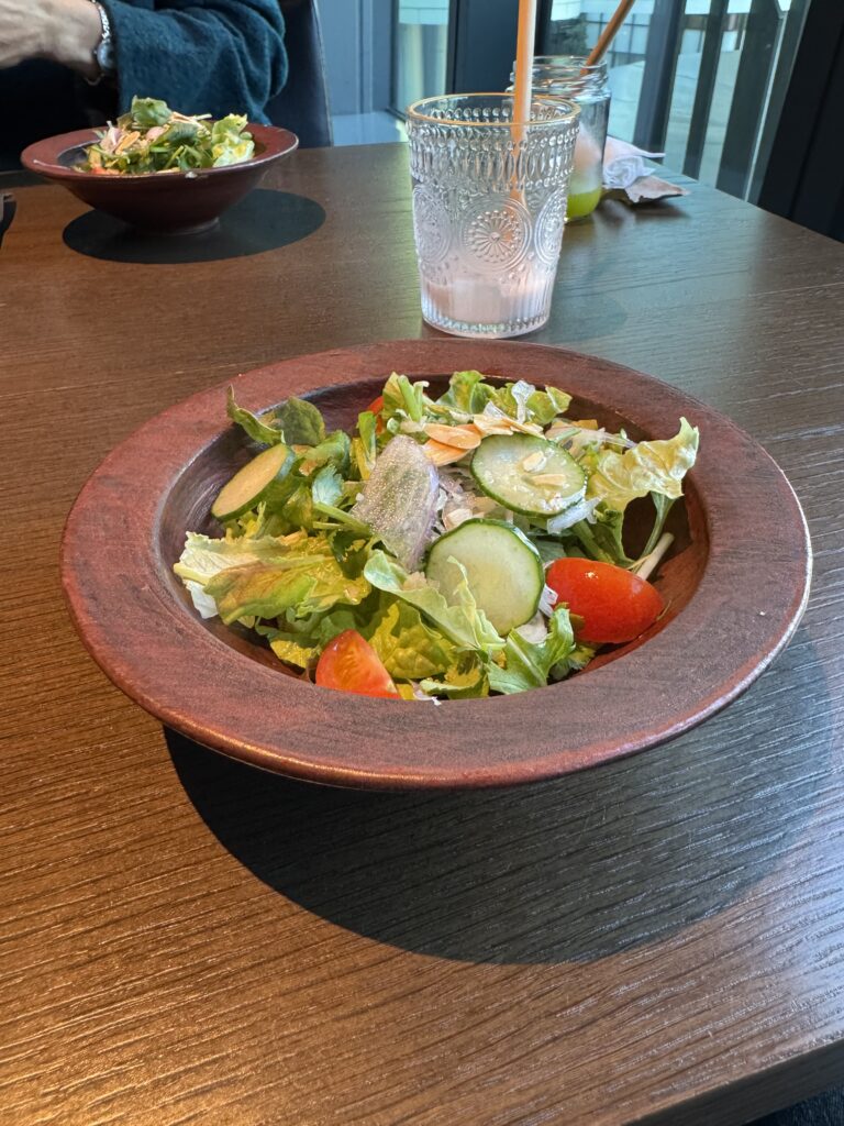 前菜のグリーンサラダは普通です 甘辛のドレッシングとパクチーがAsianなフレーバーを演出していました
