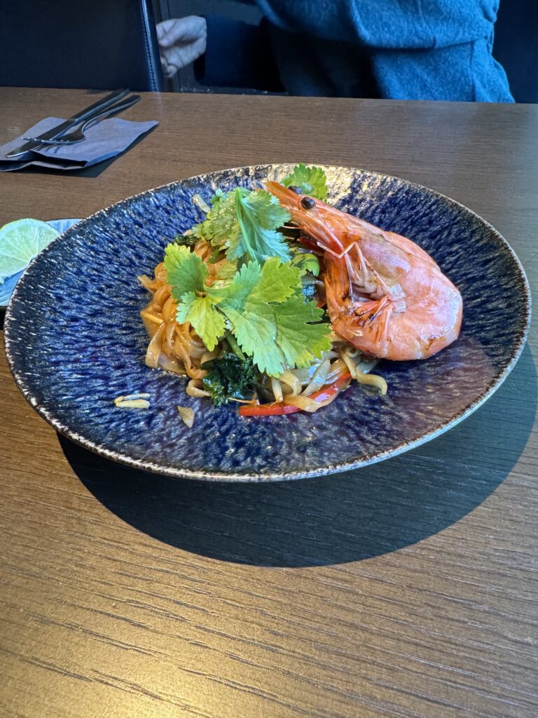 大ぶりのエビが横にドーンと添えられていました パッタイを少し貰ってテースティングしましたが、タイで食べる味に激似でした 量的に多過ぎず、女性が選んでも無理せず完食できる内容でした