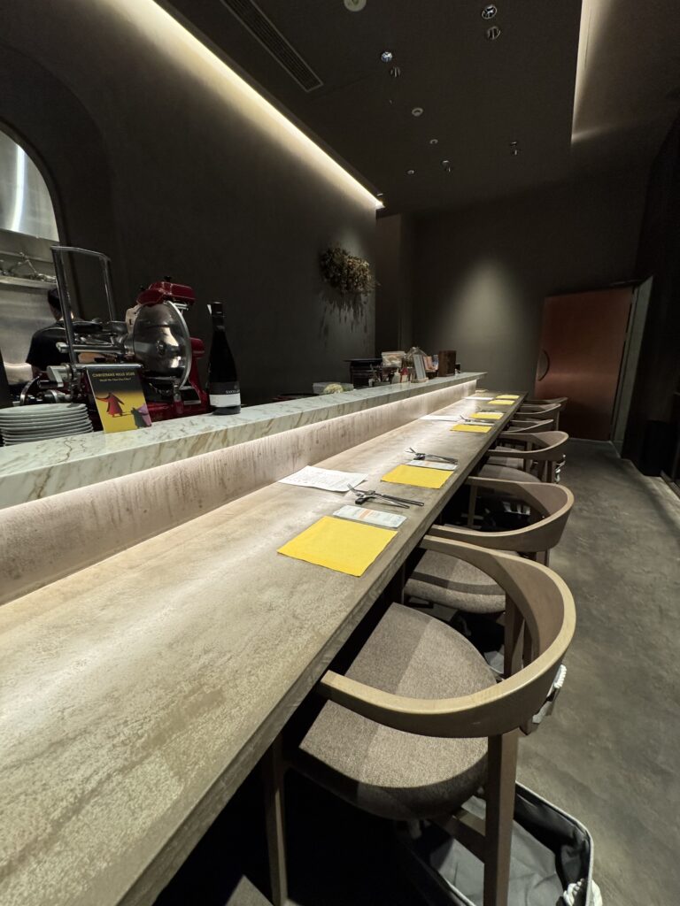 ドアを開けて中に入るととてもこざっぱりした部屋がありました カウンター席だけの料理店でした