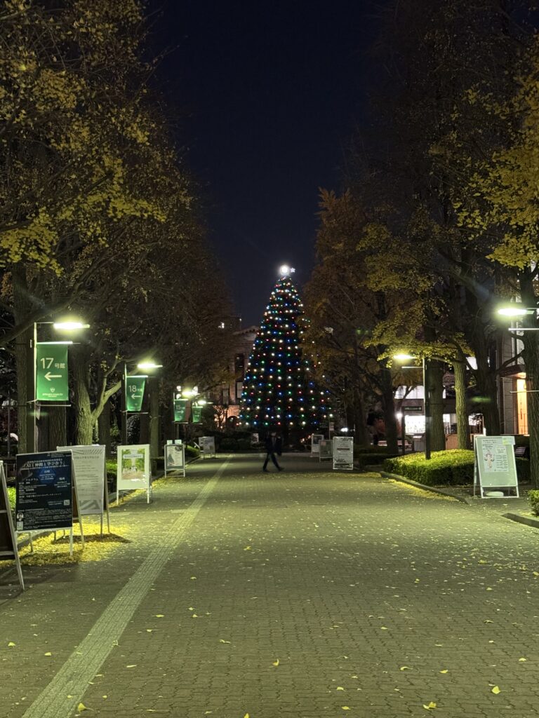 ロータリーをぐるっと回ると銀杏並木に出て、そこから振り向いたツリーが最初の写真です