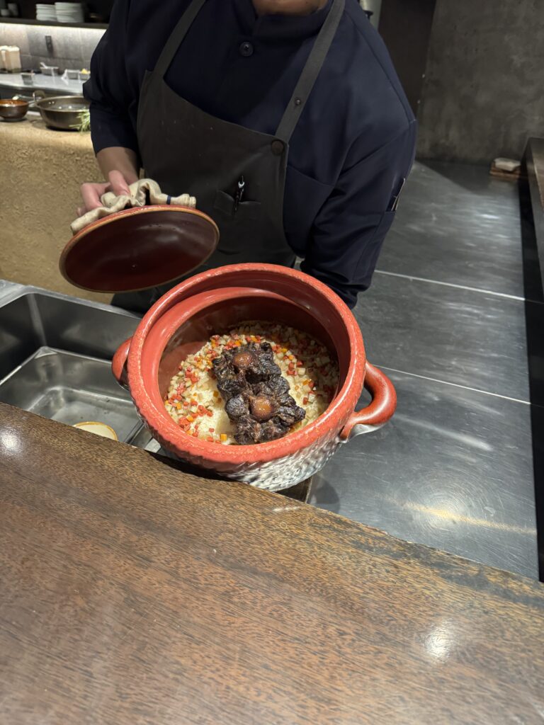 左下は、締めの土鍋ごはん 牛テールと根菜を土鍋で炊き上げご飯に乗せたもの おこげが美味しい土鍋焼きのご飯でした