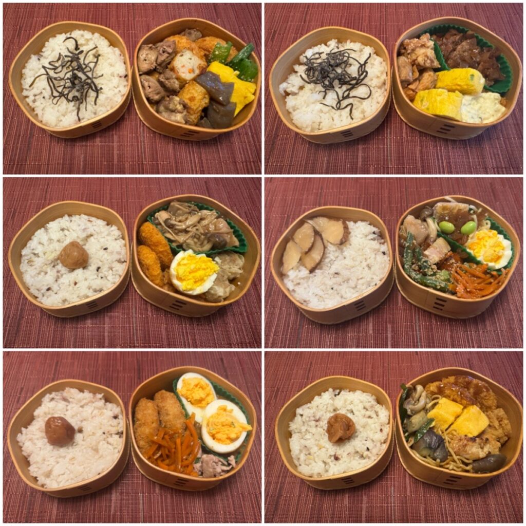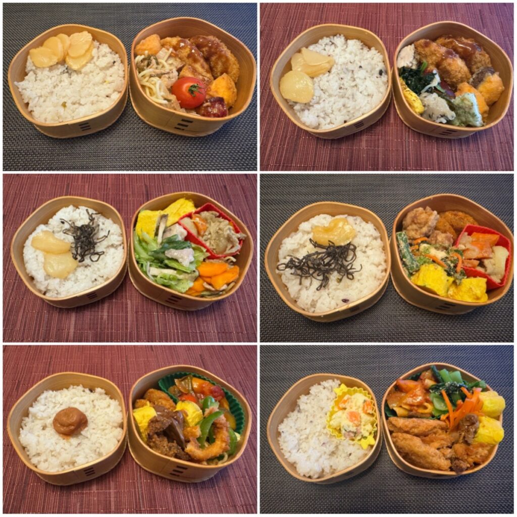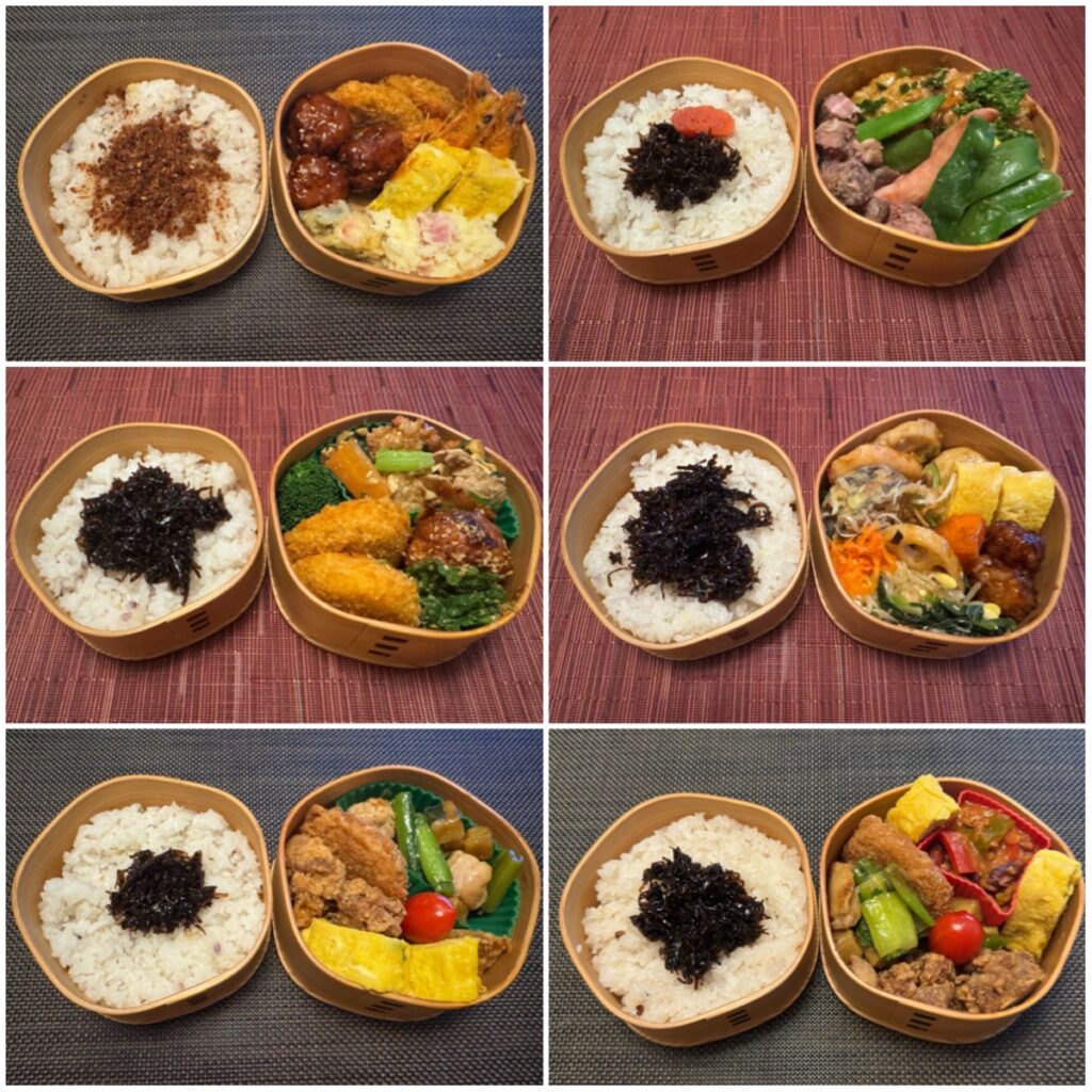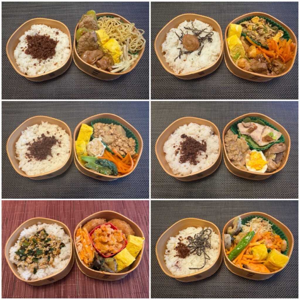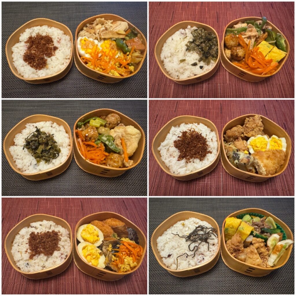 上段と中段がGW前で下段がGW後 中段右は枝豆といぶりがっこと塩昆布の和風パスタを弁当にアレンジしています