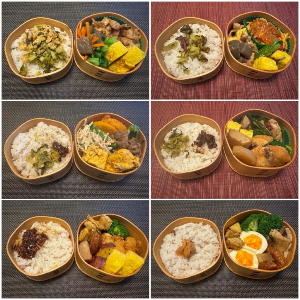 上段左は、和風ガパオライス 生姜焼きとの豪華弁当 右はミートソースの残りのアレンジ版です