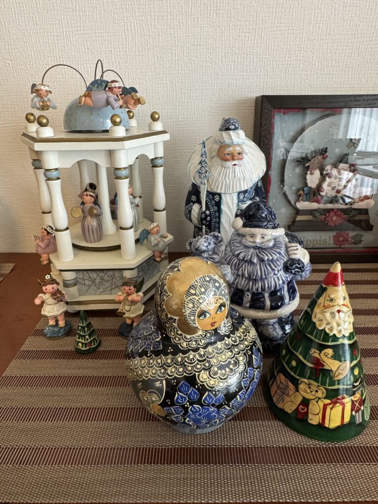 左は、スイスオルゴールのリュージュとデュッセルドルフのクリスマスマーケットで買った少女の音楽隊人形、中央後ろはロシアのサンタのマローズ爺さん、真ん中はオランダデルフト焼きのサンタ、前はロシアのマトリョーシカ、その右はノルウェイのサンタツリーです