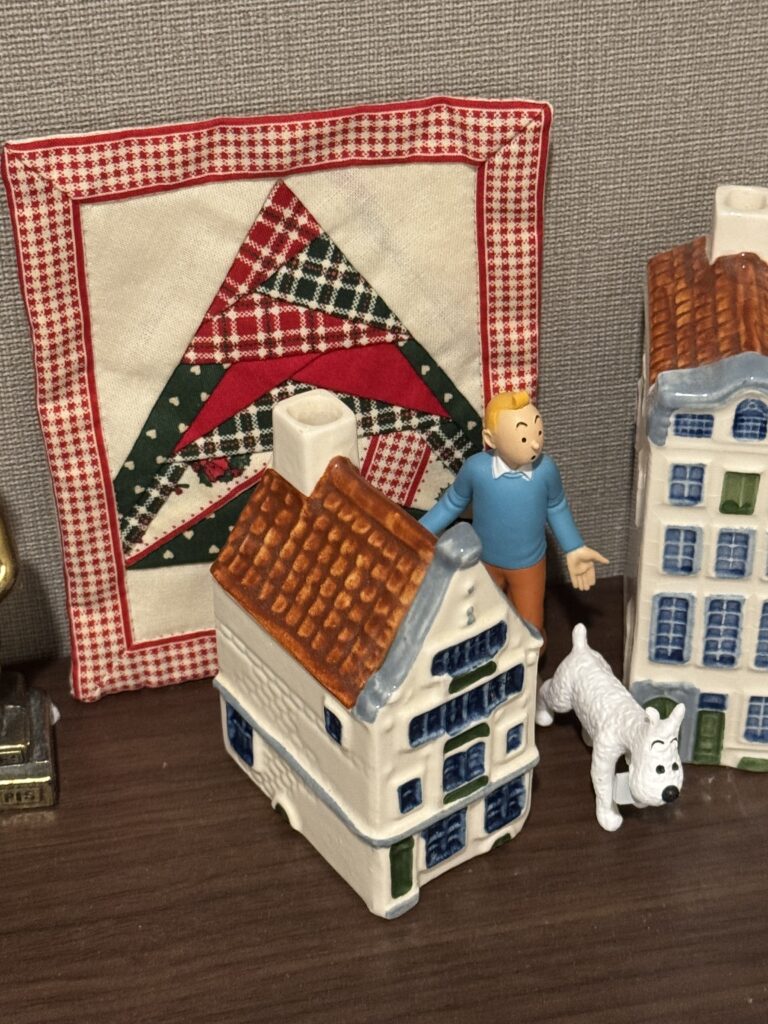 合わせてあるビルは、オランダアムステルダムのオークラでもらえるデルフト焼きのミニチュア建物 縮尺が異なるのでタンタンが巨人になっていますが、これもありかなと(笑)