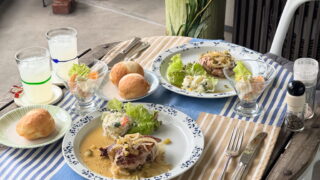 だいぶ涼しくなったのでベランダランチを再開しました作ったのは、前菜に柿とカブのマスカルポーネ和え メインはフランス料理 ポークソテー・シャルキュティエ風という一種の賄い飯です